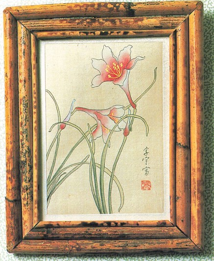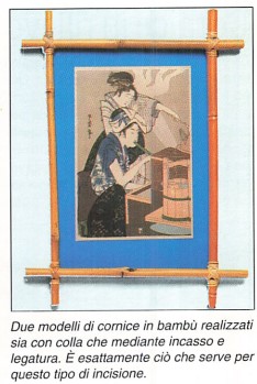 Potete anche realizzare una cornice in bambù assemblando direttamente i suoi lati mediante incastro rinforzato con una legatura. Un fondo in masonite, inchiodato contro i lati della cornice, servirà da supporto al soggetto (potete anche prevedere l’installazione di uno specchio). Anche in questo caso, il bambù viene passato sotto la fiamma di una lampada per saldare per acquistare l’aspetto scuro che ben gli si addice. Gli incastri si eseguono intagliando le canne a metà spessore (questo assemblaggio assomiglia a quello a metà legno) e per una larghezza uguale al diametro delle canne stesse. Questi assemblaggi devono essere rinforzati con colla e legature.