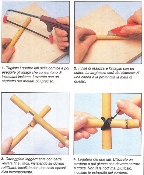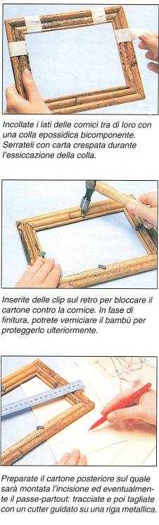 Il bambù è un materiale naturale ma anche molto elegante. Viene apprezzato per il tocco di esotismo che conferisce all’arredamento più per il suo aspetto che per la sua solidità e durata. Il bambù esiste in canne di vari diametri, per cui potrete realizzare delle cornici veramente originali: infatti, si lavora facilmente e si presta a numerose combinazioni. Non avrete quindi bisogno di utensili sofisticati, ma potrete utilizzare la vostra attrezzatura normale di cui vi servite per lavorare il legno, alla quale dovrete aggiungere un seghetto per metalli per eseguire dei tagli fini (tagli ad ugnatura e intagli) e una lampada per saldare per scurire un po’ il bambù.