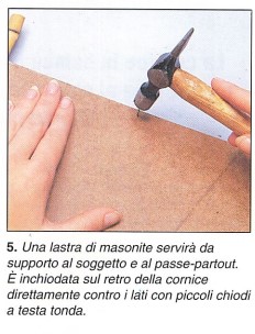Una lastra di masonite servirà da supporto al soggetto e al passepartout. Risulta essere inchiodata sul retro della cornice direttamente contro i lati con piccoli chiodi a testa tonda.