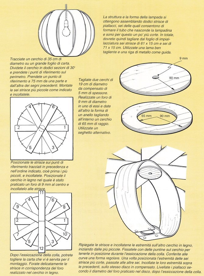 Questa lampada è costituita da strisce tagliate da un foglio di legno per impiallacciatura. Una volta piegate ed assemblate, formano un tubo che nasconde la lampadina e una copertura che conferisce alla lampada la sua forma sferica.