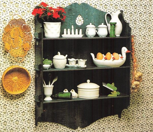 Questo piccolo portaoggetti a tre livelli è destinato ad essere appeso in cucina per esporre soprammobili o vasetti di spezie.