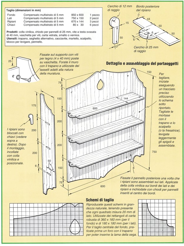 Le tecniche utilizzate sono semplici: si tratta soprattutto di un esercizio di taglio che potrete eseguire con un seghetto alternativo (elettrico) o una sega a dorso (manuale). Scegliete del compensato di buona qualità di 5 mm di spessore. Se desiderate che il mobile sia particolarmente solido, optate per il compensato di 8 mm (5 strati). Tutti i pezzi che compongono il portaoggetti possono essere tagliati da un pannello quadrato di 1220 mm di lato. Eseguite i tagli con cura. Per il fondo e i lati, tagliate prima un rettangolo, quindi le curve decorative. Seguite gli schemi quadrettati presentati alla pagina seguente. Per realizzare le mortase, sui lati e sui ripiani (per le chiavi), utilizzate prima il trapano e poi lo scalpello.