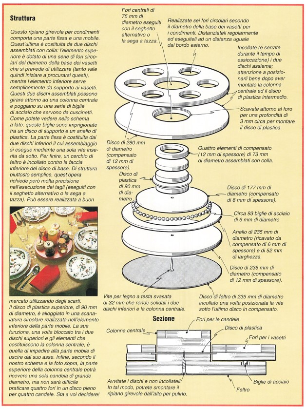 Questo ripiano girevole per condimenti comporta una parte fissa e una mobile. Quest’ultima è costituita da due dischi assemblati con colla: l’elemento superiore è dotato di una serie di fori circolari del diametro della base dei vasetti che si prevede di utilizzare (tanto vale quindi iniziare a procurarsi questi). mentre l’elemento interiore serve semplicemente da supporto ai vasetti. Questi due dischi assemblati possono girare attorno ad una colonna centrale e poggiano su una serie di biglie di acciaio che servono da cuscinetti. Come potete vedere nello schema a lato, queste biglie sono imprigionate tra un disco di supporto e un anello di plastica. La parte fissa è costituita dai due dischi inferiori il cui assemblaggio si esegue mediante una sola vite inserita da sotto. Per finire, un cerchio di feltro è incollato contro la faccia inferiore del disco dl base. Di struttura piuttosto semplice, quest’opera richiede però molta precisione nell’esecuzione dei tagli (eseguiti con il seghetto alternativo o la sega a tazza). Può essere realizzata a buon mercato utilizzando degli scarti.